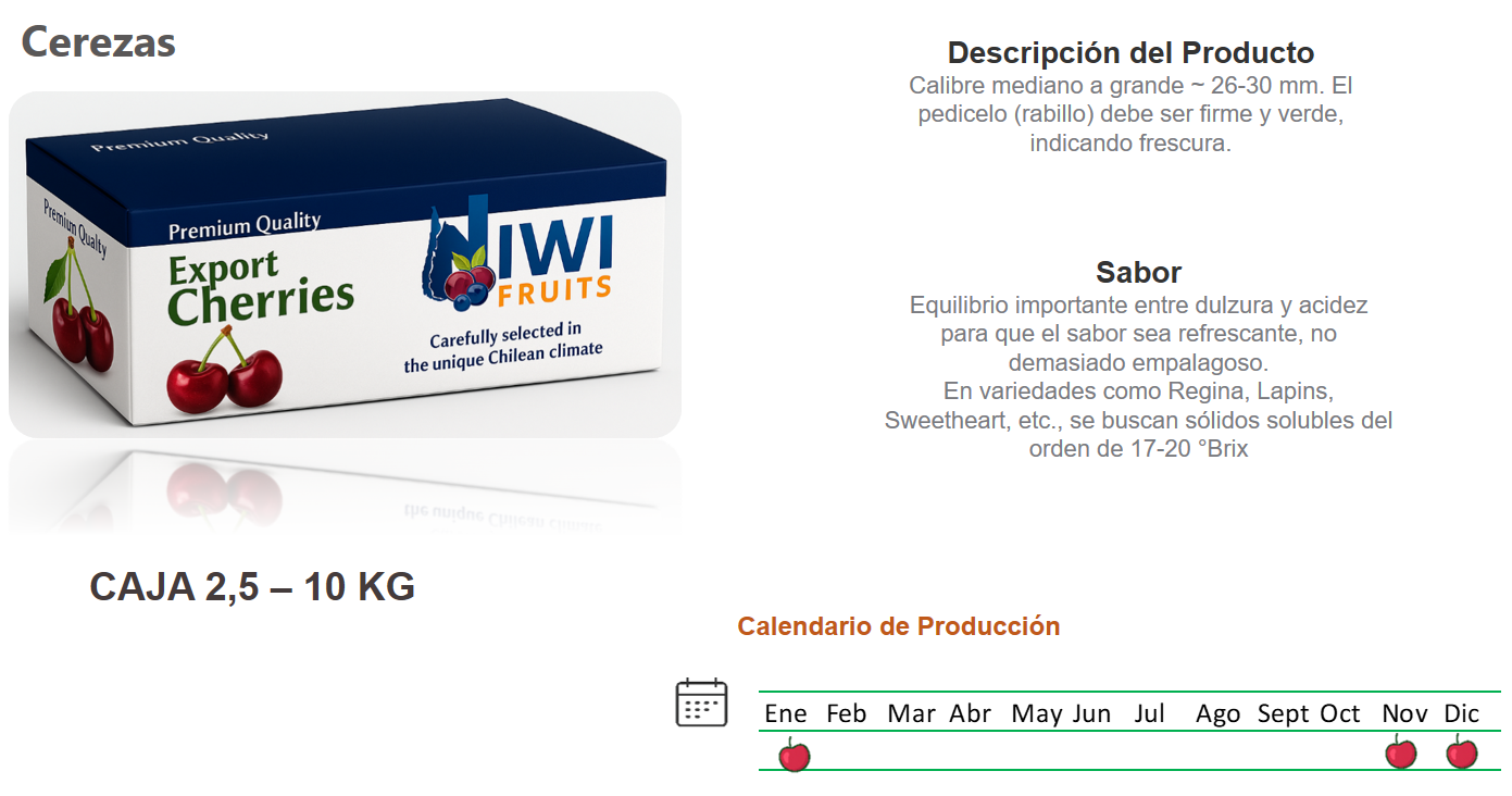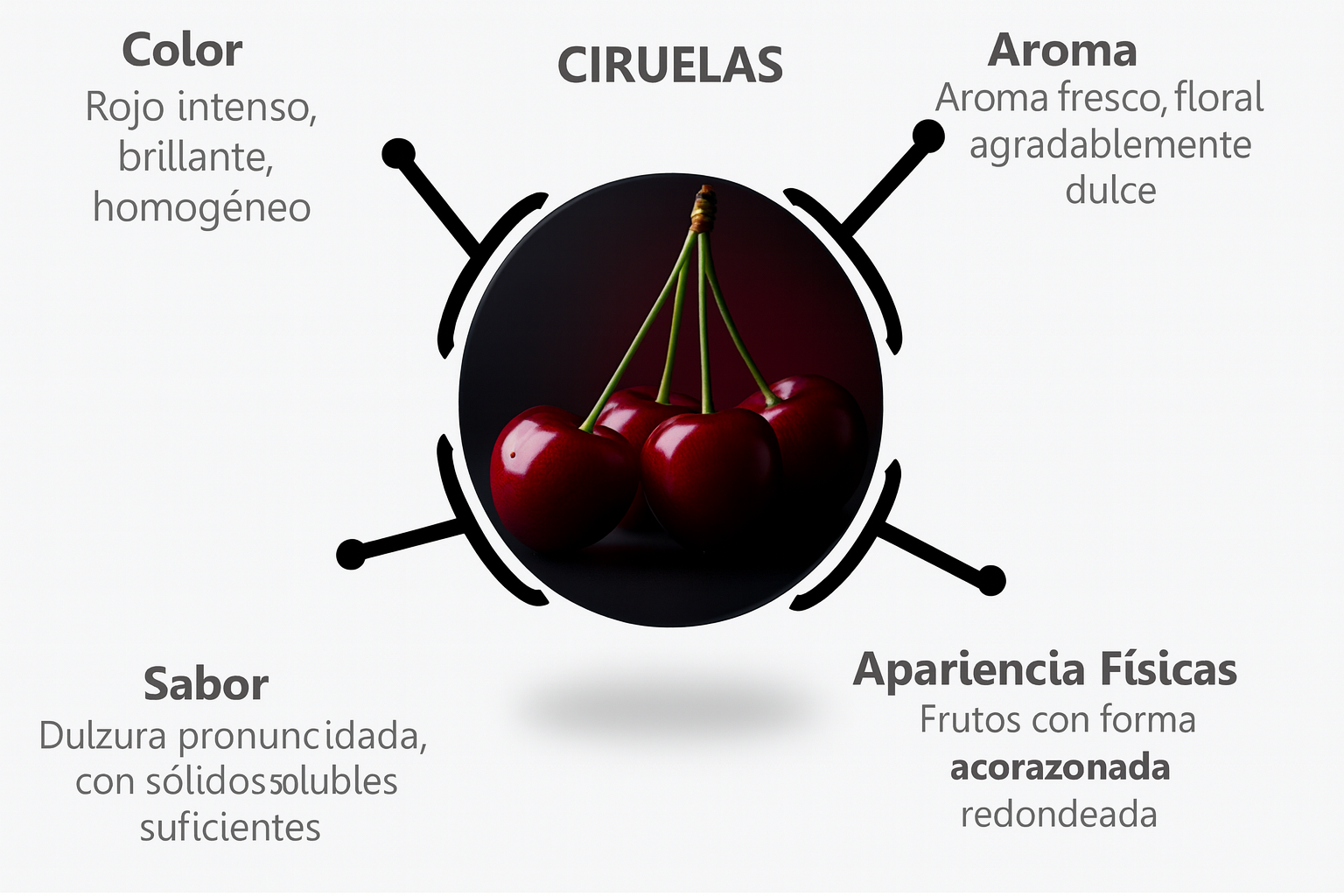 Calibre mediano a grande ~ 26-30 mm. El pedicelo (rabillo) debe ser firme y verde, indicando frescura.