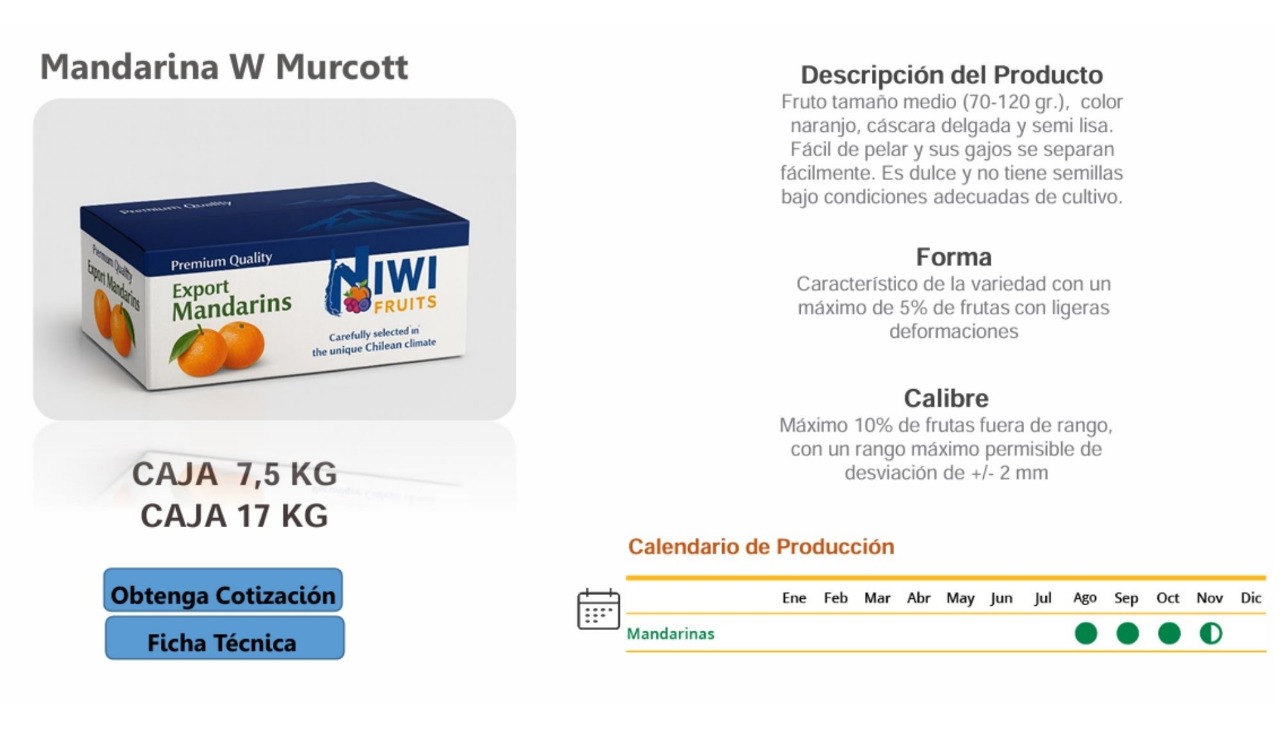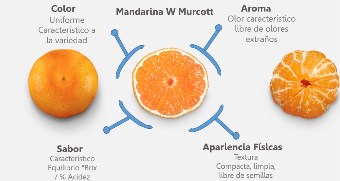 Fruto tamaño medio ( 70 120 gr.), color naranjo, cáscara delgada y semi lisa. Fácil de pelar y sus gajos se separan fácilmente. Es dulce y no tiene semillas bajo condiciones adecuadas de cultivo.